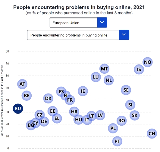 在歐盟,網(wǎng)購買(mǎi)家遇到的最常見(jiàn)的問(wèn)題是交貨速度比預期慢,21%的買(mǎi)家報告了這個(gè)問(wèn)題。9%的網(wǎng)購買(mǎi)家表示,網(wǎng)站太難使用;8%的人表示遇到的主要問(wèn)題是錯誤或損壞的商品或服務(wù)。