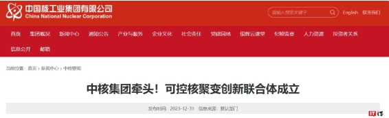 據中國核工業(yè)集團有限公司(簡(jiǎn)稱(chēng)中核集團)官網(wǎng)消息,12 月 29 日,以“核力啟航 聚變未來(lái)”為主題的可控核聚變未來(lái)產(chǎn)業(yè)推進(jìn)會(huì )在蓉召開(kāi)。由 25 家央企、科研院所、高校等組成的可控核聚變創(chuàng )新聯(lián)合體正式宣布成立。會(huì )上,中國聚變公司(籌)舉行揭牌儀式,第一批未來(lái)能源關(guān)鍵技術(shù)攻關(guān)任務(wù)正式發(fā)布,對于創(chuàng )新協(xié)同推進(jìn)聚變能源產(chǎn)業(yè)邁出實(shí)質(zhì)性步伐具有重要的里程碑意義。