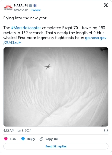 美國宇航局近日發(fā)布捷報,表示“機智號”(Ingenuity)已經(jīng)在火星上成功完成第 70 次飛行,創(chuàng )造了新的紀錄。
