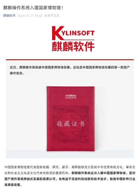 近日麒麟操作系統被中國國家博物館收藏,這也是中國國家博物館收藏的第一款國產(chǎn)操作系統。