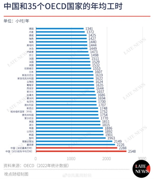 按照國際勞工組織的數據,在2022年有統計數據的167個(gè)國家中,周平均工作44小時(shí)以上的國家除中國自己共有8個(gè),分別是不丹、阿聯(lián)酋、蒙古、印度、文萊、馬來(lái)西亞、伊朗和哥倫比亞。