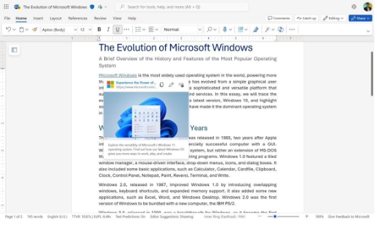 微軟近日發(fā)布新聞稿,預告網(wǎng)頁(yè)版 Word 應用即將到來(lái)的更新,為鏈接預覽提供更豐富內容。