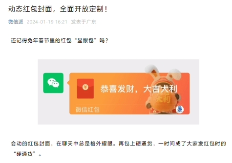 據“微信派”,微信動(dòng)態(tài)紅包封面現已全面開(kāi)放定制。官方表示,作為紅包封面升級樣式的動(dòng)態(tài)封面,其創(chuàng )意不再受限于一張圖片,定制方可以通過(guò)動(dòng)態(tài)封面講述“完整故事”。