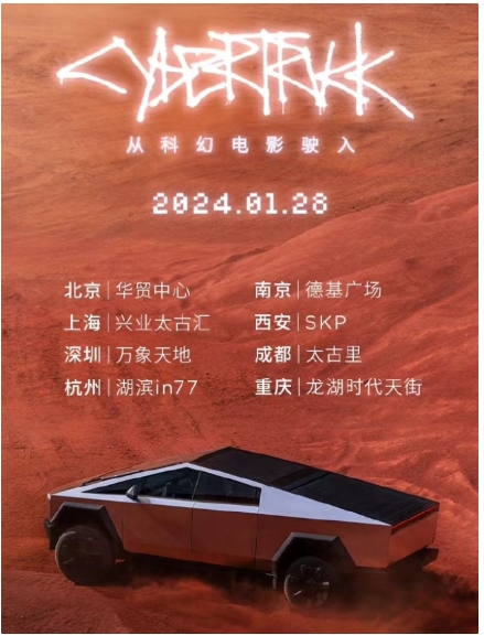 特斯拉今日宣布,Cybertruck 車(chē)型中國巡展 1 月 28 日正式開(kāi)啟,新車(chē)中文名為“特斯拉賽博越野旅行車(chē)”。