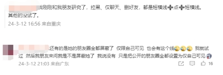 有網(wǎng)友表示,“被拉黑、僅聊天、刪好友,都是短橫線(xiàn)”“朋友圈全都屏蔽僅限自己可見(jiàn),也會(huì )有這個(gè)線(xiàn)”“拉黑和僅聊天是短線(xiàn),長(cháng)期不發(fā)朋友圈是長(cháng)線(xiàn)”。