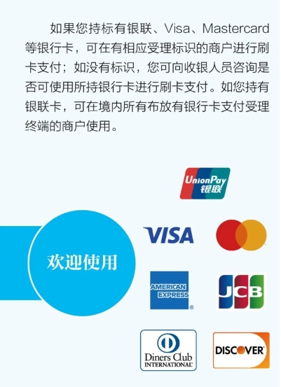 銀行卡支付方面,若外籍來(lái)華人員持銀聯(lián)、Visa、Mastercard 等銀行卡,可在有相應受理標識的商戶(hù)進(jìn)行刷卡支付;若無(wú)標識,可向收銀人員咨詢(xún)是否可使用所持銀行卡進(jìn)行刷卡支付。如持有銀聯(lián)卡,可在境內所有布放有銀行卡支付受理終端的商戶(hù)使用。