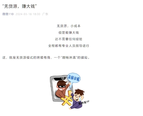 昨日傍晚,“微信 110”公眾號發(fā)文揭露了這種騙局 —— 無(wú)貨源模式的跨境電商。這種詐騙大致流程如下: