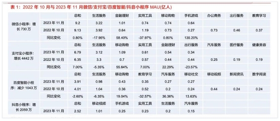 根據 Questmobile 數據,截至2023年11月,全網(wǎng)用戶(hù)月人均使用小程序個(gè)數同比上升5.0%,APP個(gè)數同比下降0.2%。