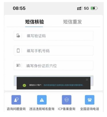 7、騰訊初審通過(guò),法人會(huì )收到一個(gè)工信部的短信,里面有一個(gè)鏈接,點(diǎn)擊鏈接進(jìn)入頁(yè)面頂部勾選“小程序”,填寫(xiě)手機號、驗證碼和身份證后六位數,提交就可以。