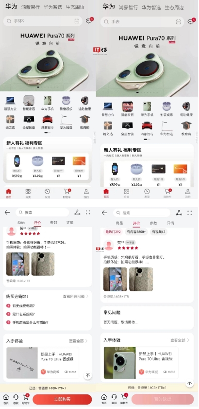 華為商城 App 在部分頁(yè)面 UI 做出了調整,更新前后對比圖(左舊右新)如下: