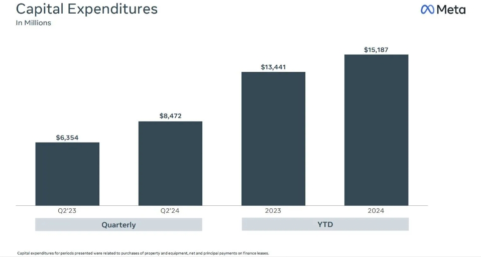 華爾街最關(guān)注指標莫過(guò)于包含AI投資的資本支出,原本市場(chǎng)預計Meta二季度資本支出將同比增約50%至95億美元,令2024全年的資本支出額達到近380億美元。