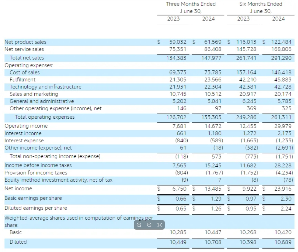 當地時(shí)間8月1日,亞馬遜發(fā)布了2024年第二季度財報,二季度營(yíng)收同比增長(cháng)10%至1480億美元,低于市場(chǎng)預期的1485億美元;凈利潤135億美元,與上年同期的67億美元相比大幅增長(cháng)101%;稀釋后每股收益為1.26美元,同比增長(cháng)216%,高于市場(chǎng)預期的1.03美元。