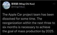天風(fēng)國際分析師郭明錤在推特表示,此前爆料已久的蘋(píng)果 Apple Car 團隊已經(jīng)解散了一段時(shí)間。如果想在 2025 年量產(chǎn) Apple Car,需