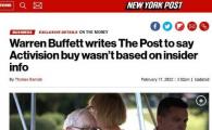 據《紐約郵報》報道,巴菲特否認了他或伯克希爾·哈撒韋的其他投資者在奧馬哈企業(yè)集團收購動(dòng)視暴雪的10億美元股份之前就已預先了解微軟